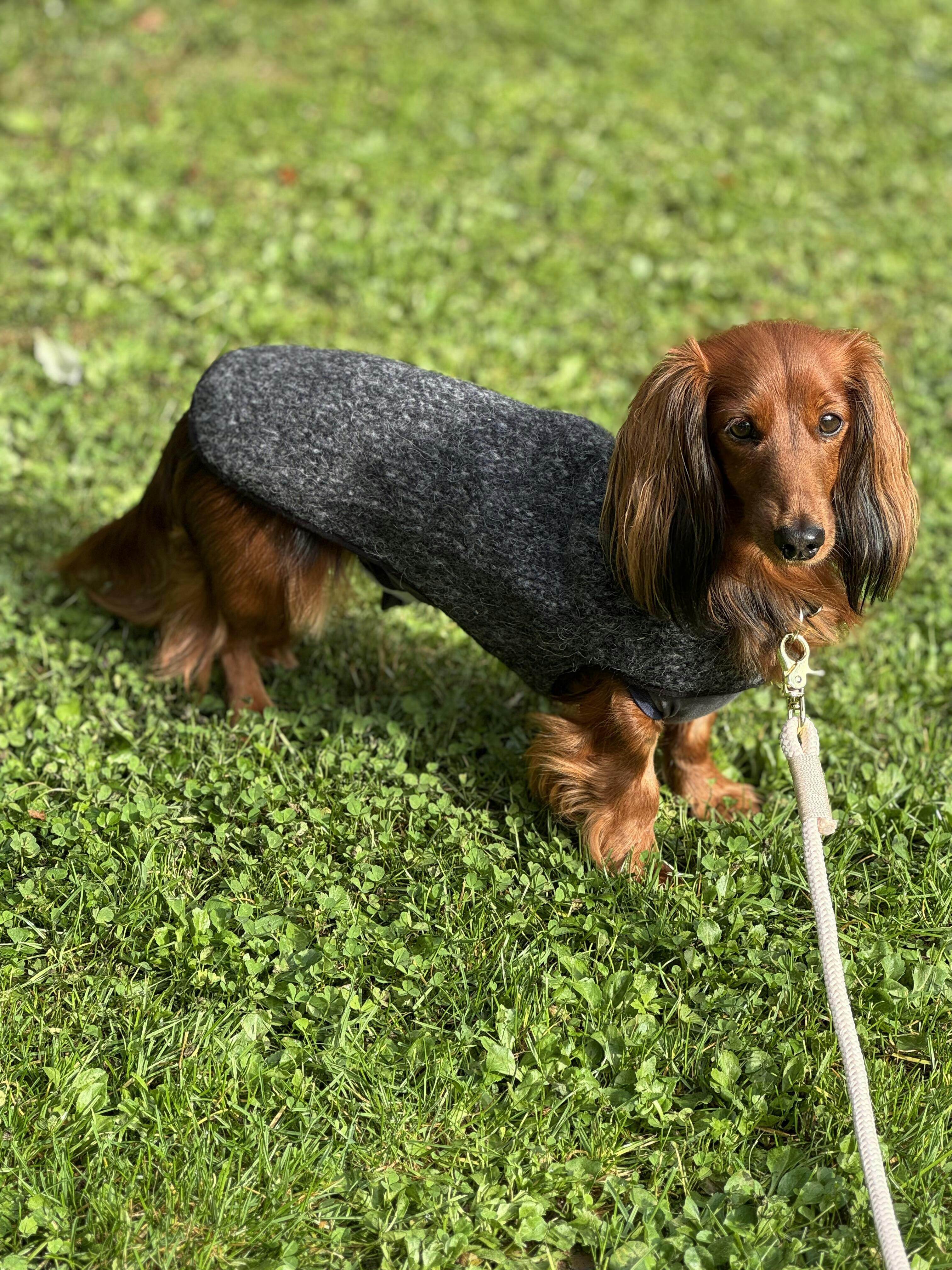 A new take on our favorite grey classic with the black trim around it. This stunning dachshund coat is the epitome of cool chic. With an Italian wool blend in different shades of grey on the outside and a black neoprene-like fabric inside you cannot go wrong. It is so lightweight, your dachshund will barely feel he's wearing something. Yet it warms the body nicely in cold wind and snow.